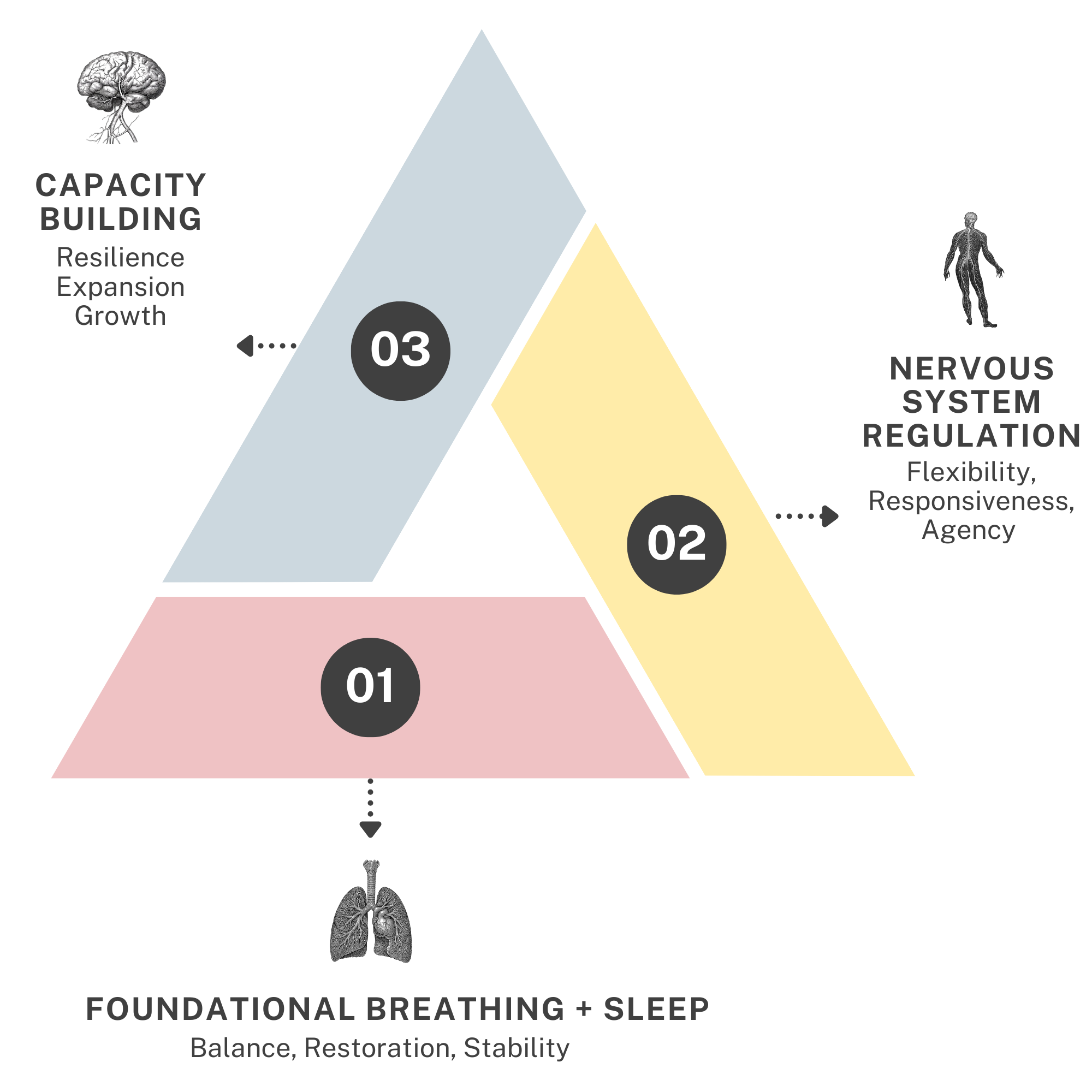 My framework combines three pillars—foundational breathing, nervous system regulation, and embodied self-awareness—to create the foundation for energy, focus, clarity and resilience.