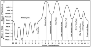 At night, these cycles correspond to the different stages of sleep (alertness, light, REM, deep, etc.). All night we go through these repeating rhythms.