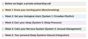 By the end of Week 5: You’ll see your progress clearly against your baseline. You’ll leave with your own Sleep Systems Manual: your personalized morning, daytime, and evening protocols, the specific practices that made the biggest difference for you, and a clear plan for what to do when things go off track.