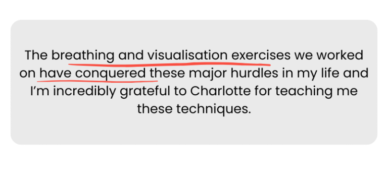 Incredibly, the work with Charlotte brought significant improvements in each of these areas. I’m amazed that I now get a full night’s sleep on most days – I used to feel some dread towards sleep but now I look forward to going to bed and feeling refreshed the next morning. I can now handle crowded areas with relative ease and I’m gradually defeating long-held anxious feelings in my life. The breathing and visualisation exercises we worked on have conquered these major hurdles in my life and I’m incredibly grateful for Charlotte for teaching me these techniques. Following the program, I practice breathing exercises everyday and I’m learning more and more about the positive impact that visualisation can have on life and challenging scenarios.